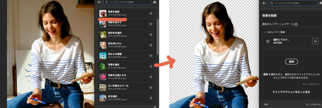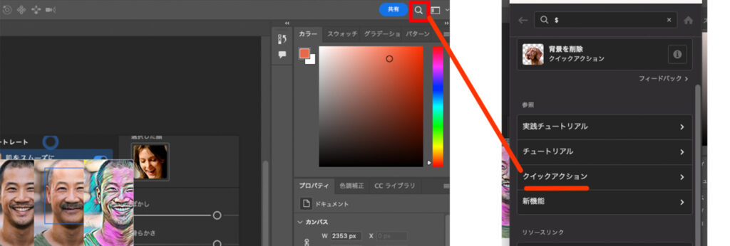 フォトショップのAI機能の中でも特筆すべきは「クイックアクション」です。