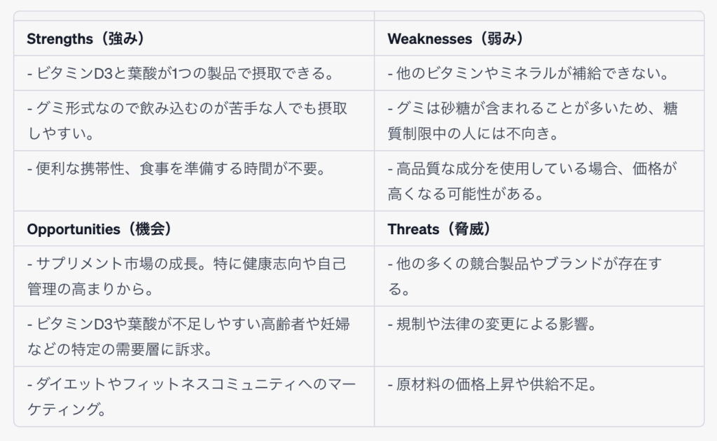 また、もっと自社独自のサービスをうたいたい場合は、ChatGPTに競合のSWOT分析を依頼するのも良いでしょう。