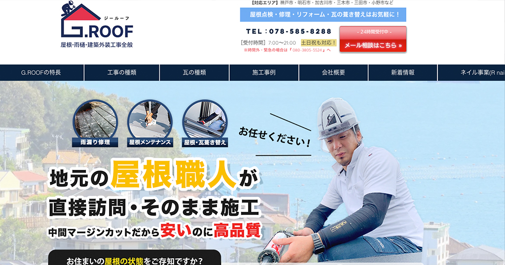 G.ROOF 様 IT・サービス ブランディングサイト 直接訪問、そのまま施工屋根の健康診断0円お客様G.ROOF 様URLhttps://www.g-roof.jp/業種・業界IT・サービス事業内容屋根工事サイト種別ブランディングサイト担当領域サイト設計 / テンプレートカスタマイズ / デザイン / ライティング制作期間3ヶ月エリア兵庫県神戸市垂水区最寄駅神戸市営地下鉄「名谷」駅